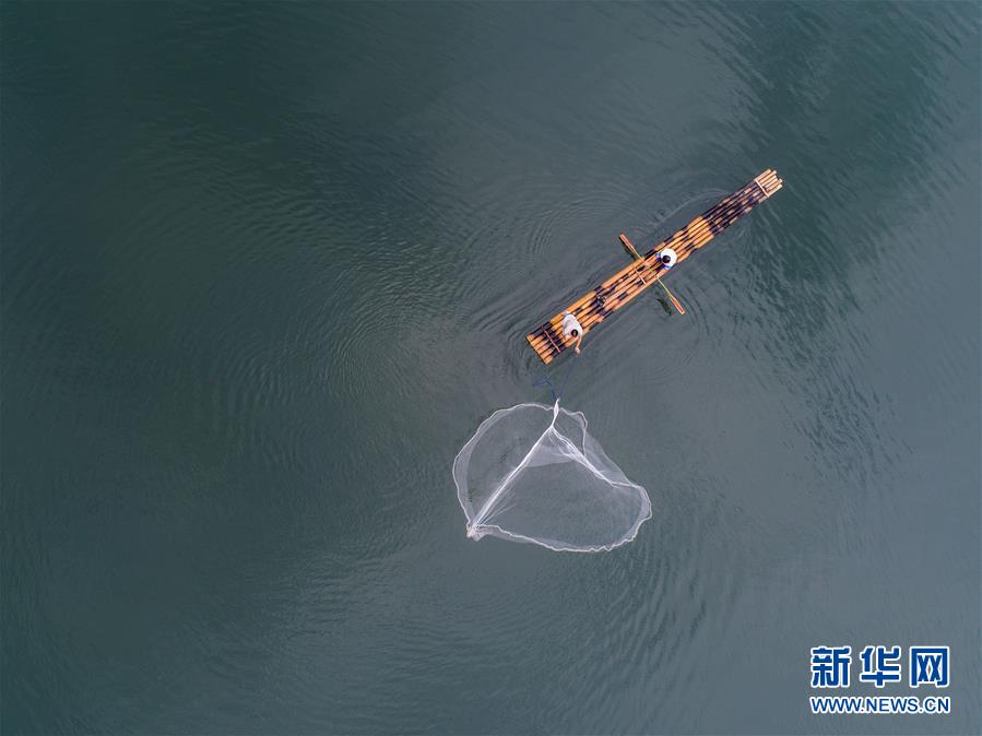 8月1日,淳安縣汾口鎮(zhèn)紅星村的漁民乘著竹排,在千島湖的支流武強(qiáng)溪上進(jìn)行撒網(wǎng)捕撈作業(yè)(無人機(jī)拍攝)。 新華社記者 徐昱攝
