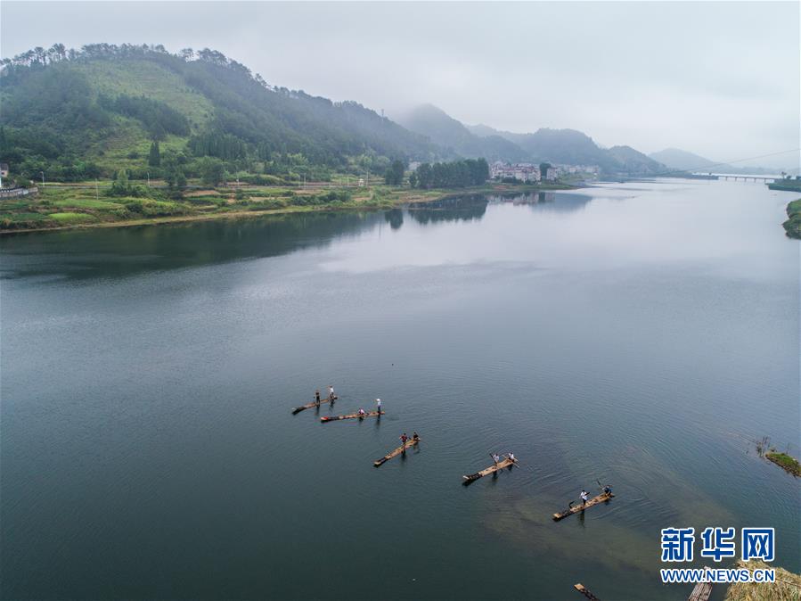 8月2日,淳安縣汾口鎮(zhèn)紅星村的漁民捕撈結(jié)束后,在千島湖的支流武強(qiáng)溪進(jìn)行劃竹排比賽(無(wú)人機(jī)拍攝)。新華社記者 徐昱 攝
