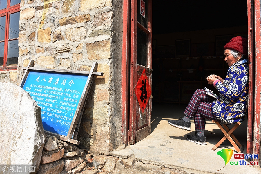 2018年3月11日,在山東省日照市五蓮縣街頭鎮(zhèn)大山深處的李崮寨村,負責管理“無人商店”的老人惠玉秀坐在商店門口納鞋墊。這個創(chuàng)建于1967年的“無人商店”,比馬云2017年創(chuàng)辦的“無人超市”早了50年,至今仍然營業(yè)。