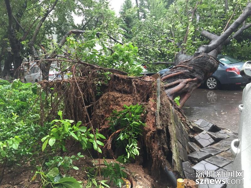 在蓮花北村靠近北環(huán)中學(xué)的小路,記者注意到拉起警戒線,有多株樹(shù)木經(jīng)不住大風(fēng)考驗(yàn),已投降就地倒下。