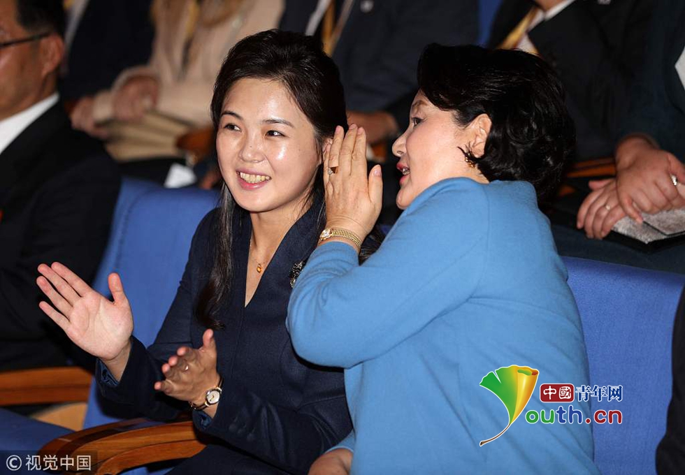 當(dāng)?shù)貢r(shí)間2018年9月18日,朝鮮平壤,韓國(guó)總統(tǒng)文在寅夫人金正淑在朝鮮國(guó)務(wù)委員會(huì)委員長(zhǎng)金正恩夫人李雪主的陪同下參觀平壤金元均音樂(lè)大學(xué)。圖片作者:視覺(jué)中國(guó)