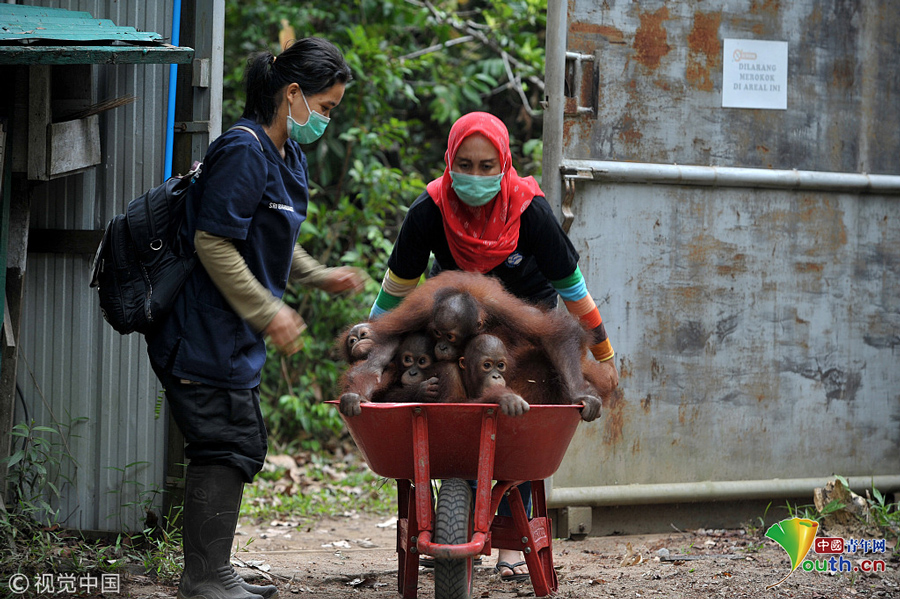當(dāng)?shù)貢r間2018年9月18日,印尼加里曼丹克塔邦,國際動物救援(IAR)猩猩安全與保護(hù)中心里,飼養(yǎng)員用獨(dú)輪車把猩猩寶寶送到森林學(xué)校。圖片作者:Newscom