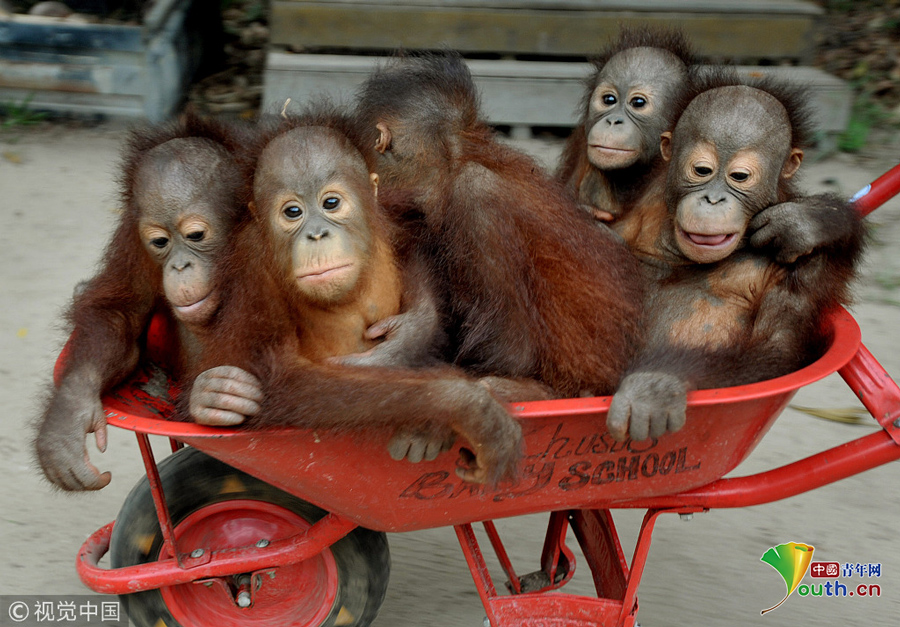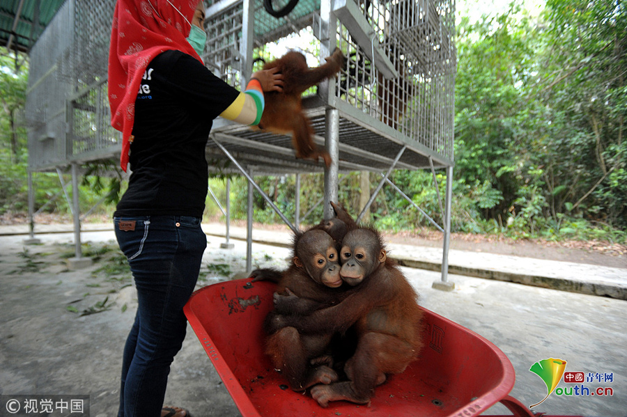 印尼加里曼丹克塔邦,國(guó)際動(dòng)物救援(IAR)猩猩安全與保護(hù)中心里,飼養(yǎng)員用獨(dú)輪車(chē)把猩猩寶寶送到森林學(xué)校。圖片作者:Newscom