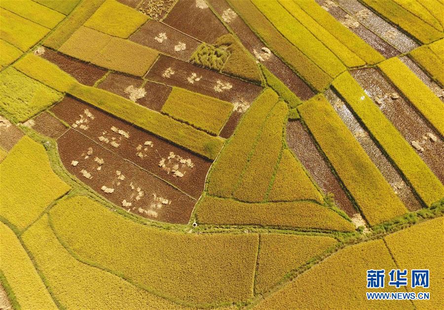 這是廣南縣八寶鎮(zhèn)壩龍村的稻田景色(9月20日無人機(jī)拍攝)。 云南省文山壯族苗族自治州廣南縣八寶鎮(zhèn)今年種植優(yōu)質(zhì)水稻22000余畝,秋收季節(jié),田野里一片金黃,景色如畫。 新華社記者楊宗友攝
