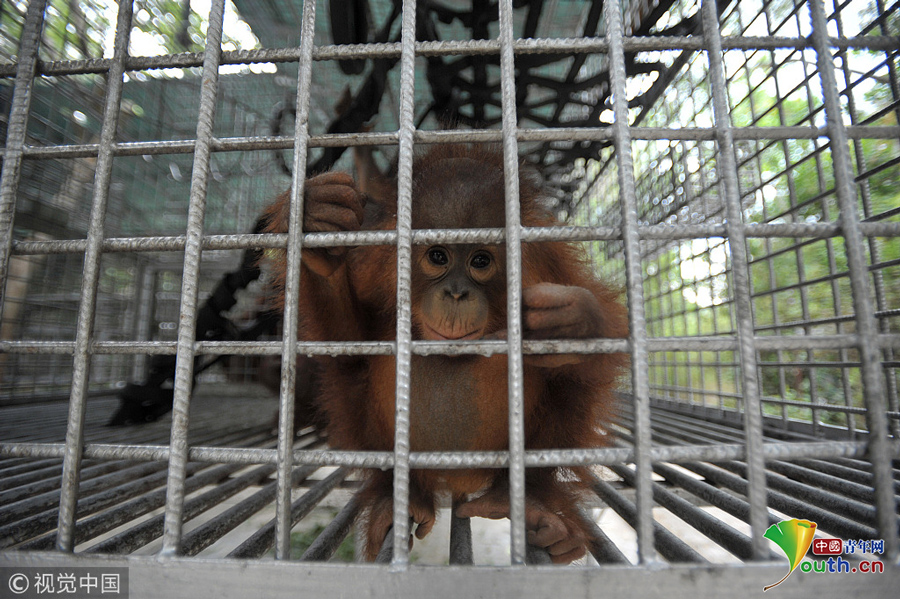 當(dāng)?shù)貢r(shí)間2018年9月18日,印尼加里曼丹克塔邦,國(guó)際動(dòng)物救援(IAR)猩猩安全與保護(hù)中心里,飼養(yǎng)員用獨(dú)輪車把猩猩寶寶送到森林學(xué)校。圖片作者:Newscom