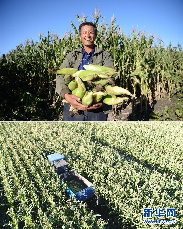 這張拼版照片顯示的是:上圖,9月18日,黑龍江省綏化市青岡縣禎祥鎮(zhèn)莊稼屯村民莊秀彬捧著剛收獲的玉米;下圖,9月18日,莊秀彬駕駛農(nóng)機(jī)收獲玉米(無人機(jī)拍攝)。  新華社記者王凱攝