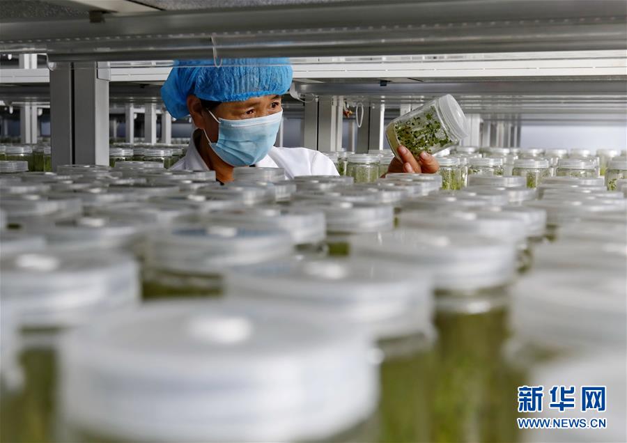 9月23日,張北縣小二臺(tái)鎮(zhèn)一家馬鈴薯育種中心的技術(shù)員在培育室查看薯苗長(zhǎng)勢(shì)。 近年來(lái),地處壩上地區(qū)的河北省張北縣因地制宜,積極推進(jìn)馬鈴薯產(chǎn)業(yè)化發(fā)展,形成了馬鈴薯繁種育種、商品薯種植、倉(cāng)儲(chǔ)、加工為一體的產(chǎn)業(yè)鏈,帶動(dòng)農(nóng)民增收致富。 新華社記者楊世堯攝