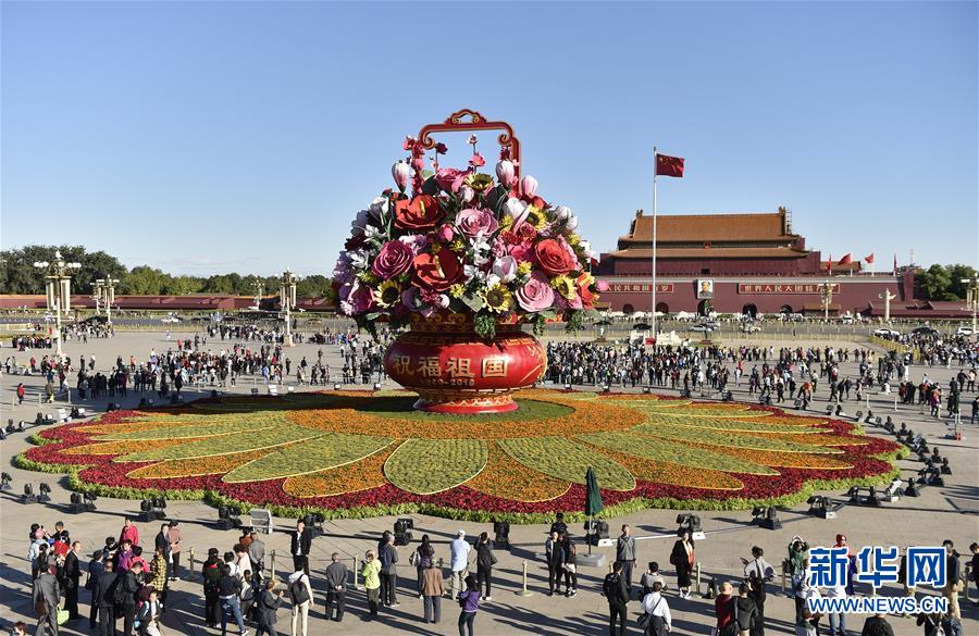 當日,“祝福祖國”巨型花籃在北京天安門廣場全面亮相。據(jù)了解,從2011年開始,“祝福祖國”巨型花籃一直作為天安門廣場中心花壇的主景在國慶節(jié)期間向祖國獻禮。今年花籃內布置有紅掌、梅花、康乃馨、向日葵、蘭花、月季等多種仿真花卉,寓意幸福吉祥。 新華社記者 李賀 攝