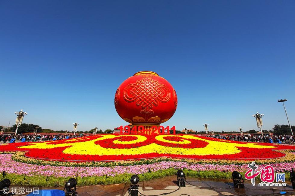 2011年天安門廣場(chǎng)中心花壇的主體部分為一只喜慶的大紅燈籠,底部襯托著由花草組成的祥云圖案,南北兩側(cè)分別立有“1949-2011”、“祝福祖國(guó)”等字符。燈籠、中國(guó)結(jié)、祥云等傳統(tǒng)元素,以及中國(guó)紅和金色等代表中國(guó)喜慶顏色的運(yùn)用,使花壇的中國(guó)傳統(tǒng)文化韻味十足?;▔w造型簡(jiǎn)潔、主題鮮明、熱烈喜慶,表現(xiàn)了對(duì)祖國(guó)繁榮富強(qiáng)、欣欣向榮的美好祝福。