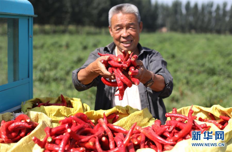 9月16日,阜城縣王集鄉(xiāng)南張莊村農(nóng)民在展示采摘的辣椒。近年來(lái),河北省阜城縣王集鄉(xiāng)在推進(jìn)產(chǎn)業(yè)富民過(guò)程中,積極引導(dǎo)農(nóng)民調(diào)整農(nóng)業(yè)產(chǎn)業(yè)結(jié)構(gòu),按照品種特色化、種植規(guī)?;?、產(chǎn)銷一體化的“公司+基地+農(nóng)戶”的經(jīng)營(yíng)模式,鼓勵(lì)農(nóng)民發(fā)展特色辣椒種植,推行“訂單種植”模式,開(kāi)辟出了一條農(nóng)民創(chuàng)收新路徑。目前,阜城縣王集鄉(xiāng)辣椒種植面積3100余畝,每畝年收益2500元以上,帶動(dòng)當(dāng)?shù)剞r(nóng)民實(shí)現(xiàn)增收。新華社記者朱旭東攝