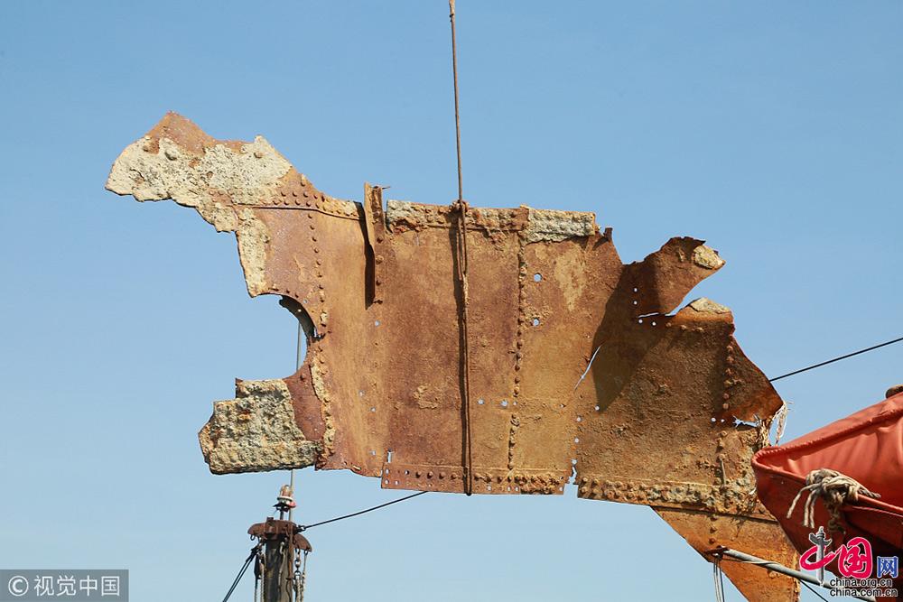 2018年9月25日,遼寧大連,考古工作人員把一片“經(jīng)遠(yuǎn)艦”裝甲進(jìn)行吊裝轉(zhuǎn)運(yùn)。視覺中國