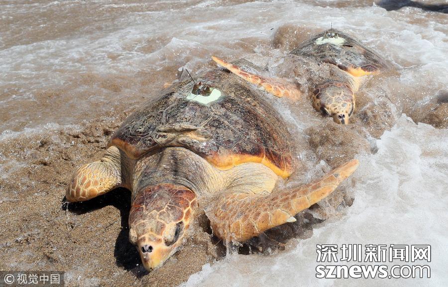 韓國(guó)水產(chǎn)部門舉辦海龜放生儀式 海龜背“天線”重歸大海