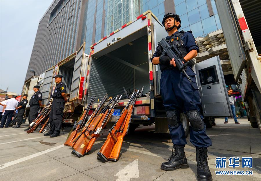 9月20日,在河北省邯鄲市天鴻廣場(chǎng),警方展示即將銷(xiāo)毀的非法槍支。 新華社記者 王曉 攝