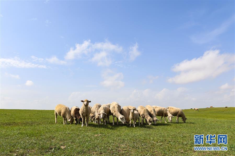 羊群在錫林郭勒盟正藍(lán)旗的草原上覓食(7月16日攝)。盛夏時(shí)節(jié),內(nèi)蒙古錫林郭勒草原一碧千里,遙接天際。藍(lán)天白云之下,牛羊悠閑自在,馬群奔馳其中,風(fēng)光旖旎。 新華社記者 劉磊 攝