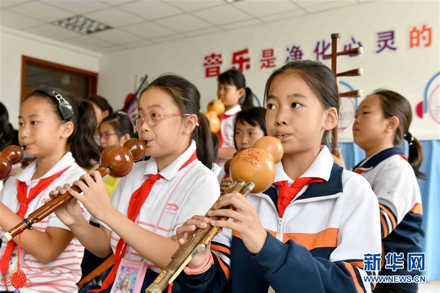 9月29日,在威海市經(jīng)濟技術(shù)開發(fā)區(qū)新都小學,學生們吹奏葫蘆絲。新華社記者郭緒雷攝