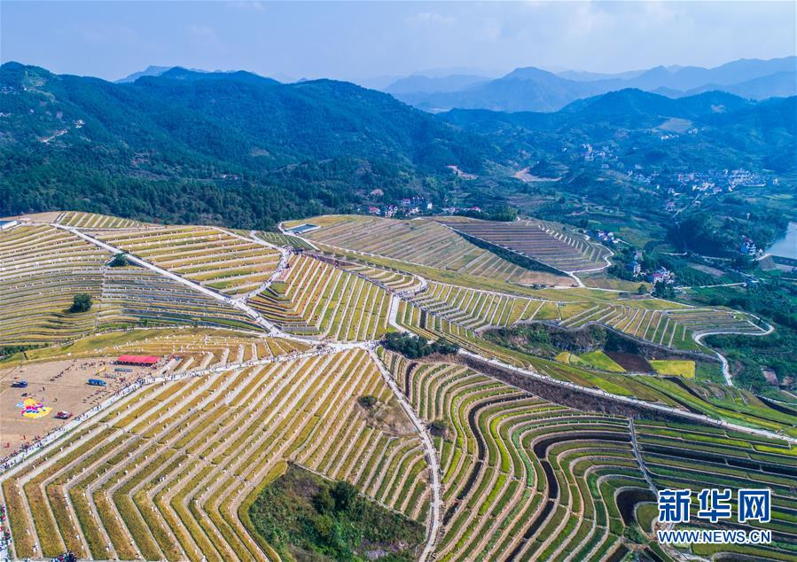9月29日拍攝的秋日中的建德市大洋鎮(zhèn)高垣村梯田風(fēng)景。當日,2000多名太極拳愛好者在浙江省建德市大洋鎮(zhèn)高垣村的千畝梯田上參加太極拳表演,吸引很多當?shù)厝撕陀慰颓皝碛^賞,助力當?shù)亟鹎飼r節(jié)鄉(xiāng)村旅游。近兩年來,大洋鎮(zhèn)充分利用土地整治后形成的千畝梯田打造農(nóng)業(yè)觀光綜合體,發(fā)展綜合型農(nóng)業(yè)觀光旅游,為鄉(xiāng)村振興注入新活力。新華社記者徐昱攝