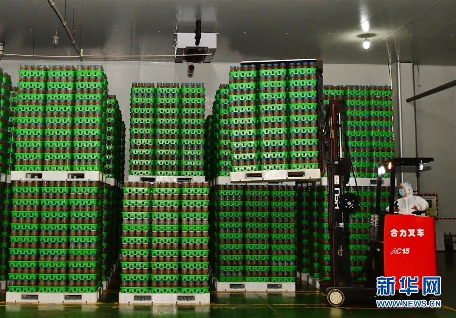 在位于清豐縣的河南龍豐實(shí)業(yè)股份有限公司,一名工人操作叉車(chē)在培養(yǎng)車(chē)間搬運(yùn)接種后的食用菌栽培瓶(9月28日攝)。新華社記者馮大鵬攝