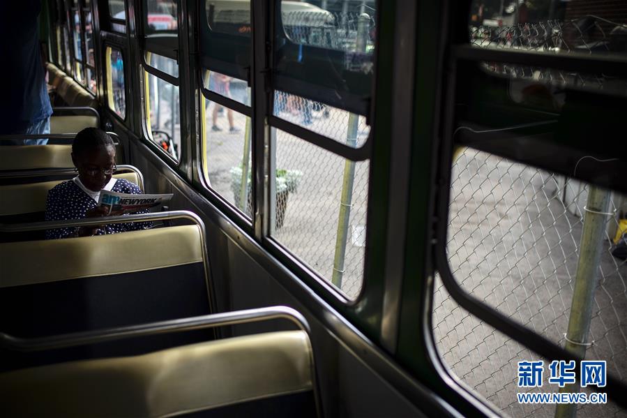 10月7日,在美國(guó)紐約舉行的巴士節(jié)上,一名女子在3100號(hào)巴士上看報(bào)。該車型是美國(guó)首批配備空調(diào)的巴士車型之一。 新華社記者李木子攝