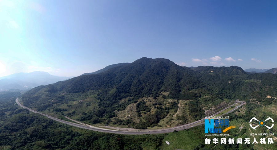 拼接照片:這是廈蓉高速南靖縣建安隧道(右)外的長下坡路段。改擴建工程竣工之后,長下坡將改成上行線,變?yōu)樯掀侣范危o人機拍攝)。新華網 肖和勇 攝