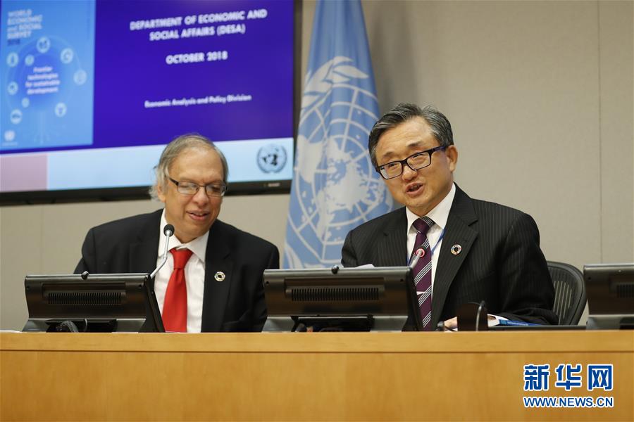10月8日,在位于紐約的聯(lián)合國總部,聯(lián)合國負責經(jīng)濟和社會事務的副秘書長劉振民(右)向記者介紹《2018年世界經(jīng)濟和社會概覽》。 新華社記者李木子攝