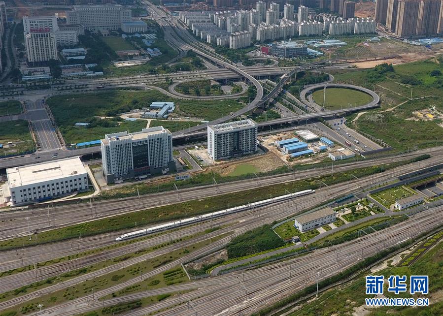 一列動車在南寧市區(qū)行駛(9月4日無人機(jī)拍攝)。 廣西壯族自治區(qū)成立60年來,鐵路建設(shè)發(fā)生翻天覆地的變化。來自中國鐵路南寧局集團(tuán)有限公司的數(shù)據(jù)顯示,1958年廣西鐵路總里程為1346.3公里,如今廣西鐵路總里程達(dá)5191公里。廣西與周邊相鄰省份間實(shí)現(xiàn)動車“公交化”開行。此外,北部灣港—重慶班列、東盟海產(chǎn)品冷鏈班列、“百色一號”果蔬專列等的開通和運(yùn)營,強(qiáng)化了鐵路供給的針對性和有效性。鐵路成為助推廣西經(jīng)濟(jì)社會快速發(fā)展的“大動脈”。 新華社記者陸波岸攝