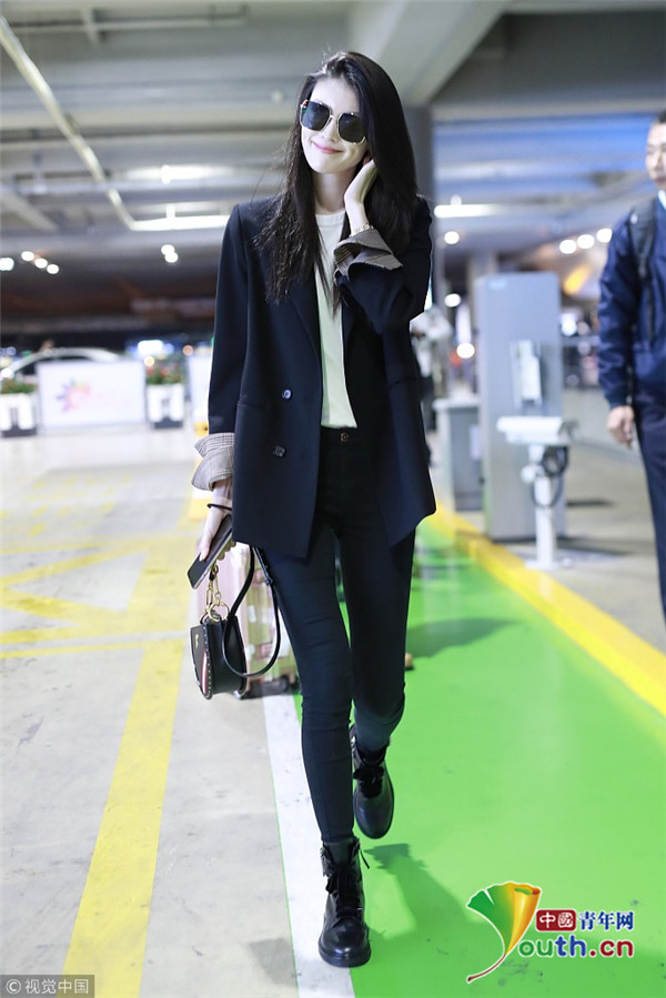 2018年10月15日,上海,何穗亮相機場。她身穿深色西裝搭配黑色緊身褲大秀超模身材,簡約造型依舊高級感十足,輕撩秀發(fā)散發(fā)女人味。