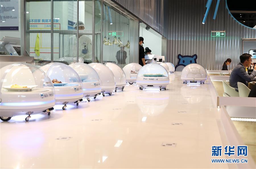 近日,一家由機(jī)器人充當(dāng)送餐服務(wù)員的盒馬機(jī)器人餐廳現(xiàn)身上海國(guó)家會(huì)展中心,為顧客帶來一種用餐新選擇。
