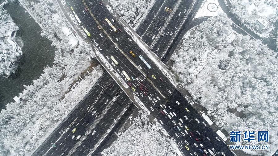 從空中俯瞰雪后的烏魯木齊西大橋(10月18日無人機拍攝)。10月18日,新疆烏魯木齊迎來一場降雪。 新華社記者 江文耀 攝