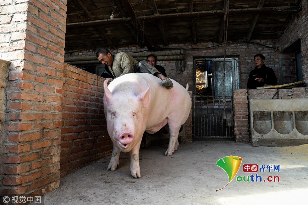 村里一位83歲的老人在圍觀時(shí)說,活了一輩子第一次見到這么大的豬,豬是好豬,但是賣不出去愁人啊。900斤大豬是個(gè)什么概念?體長2米25、腰圍1米75,站立高度1米10。此時(shí)此刻,900斤大豬完全不知主人的苦,也完全不知道外面的世界發(fā)生了什么。圖為養(yǎng)豬戶張先生險(xiǎn)些從900斤大豬背上摔下來。圖片作者:棋簿紫/視覺中國