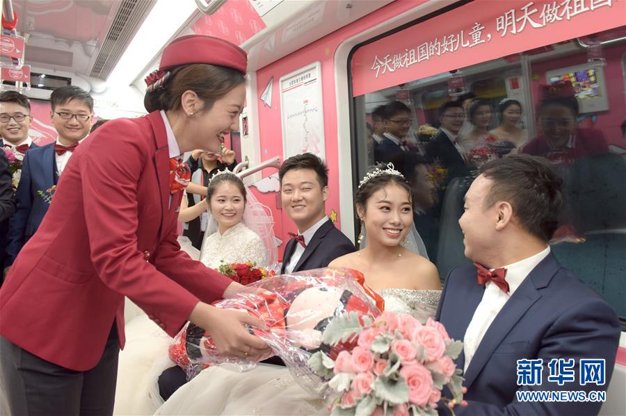 10月18日,在合肥市地鐵一號(hào)線車廂內(nèi),地鐵工作人員向新人們送禮物。當(dāng)日,中鐵四局集團(tuán)城市軌道交通工程分公司的18對(duì)新人在安徽合肥地鐵一號(hào)線的車廂里舉行了一場集體婚禮儀式。 新華社記者 郭晨 攝