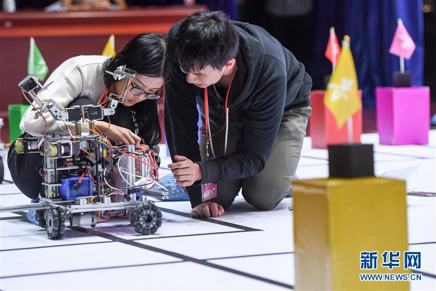當(dāng)日,中國科學(xué)技術(shù)大學(xué)第十八屆RoboGame機(jī)器人大賽舉行,該校21支學(xué)生代表隊(duì)帶著他們設(shè)計(jì)和制作的機(jī)器人參賽。新華社記者張端攝