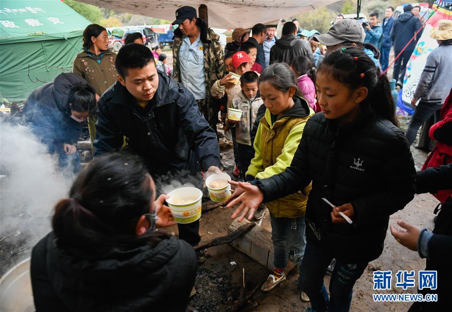 波羅鄉(xiāng)工作人員在熱多村安置點(diǎn)內(nèi)的“臨時(shí)做飯點(diǎn)”為波羅鄉(xiāng)第一小學(xué)學(xué)生盛晚飯(10月14日攝)。