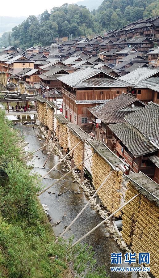 貴州省黔東南苗族侗族自治州從江縣高增鄉(xiāng)占里村晾滿稻谷的禾晾架與侗寨房屋相映成景(10月17日無人機(jī)拍攝)。 金秋時(shí)節(jié),農(nóng)民們忙著收獲成熟的農(nóng)作物,喜迎豐收。 新華社記者陳曄華攝