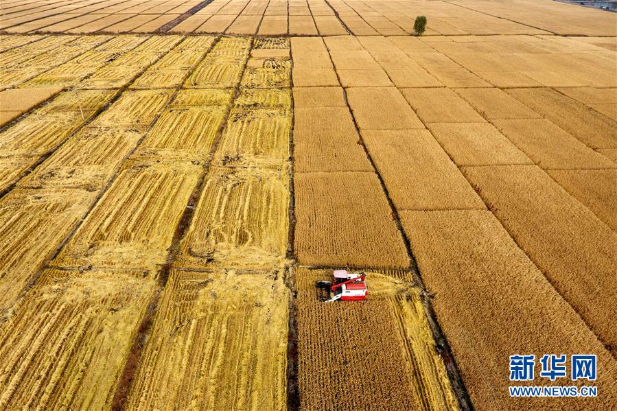 在太原市晉源區(qū)赤橋村,收割機(jī)在稻田里作業(yè)(10月17日無人機(jī)拍攝)。近日,山西省太原市晉源區(qū)2000多畝水稻迎來收割季。 金秋時節(jié),農(nóng)民們忙著收獲成熟的農(nóng)作物,喜迎豐收。 新華社記者 詹彥 攝
