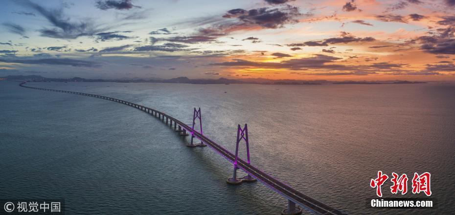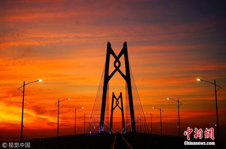 2018年7月18日,珠海,滿天紅霞,亮燈后的港珠澳大橋跨立在伶仃洋上,進入通車前的最后準(zhǔn)備。張由瓊 攝 圖片來源:視覺中國