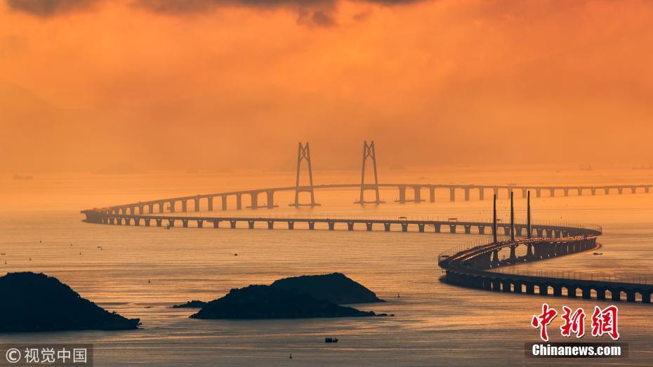 2018年5月21日,廣東珠海,太陽從香港大嶼山慢慢升起,港珠澳大橋猶如一條巨龍蜿蜒盤繞在海面上。
