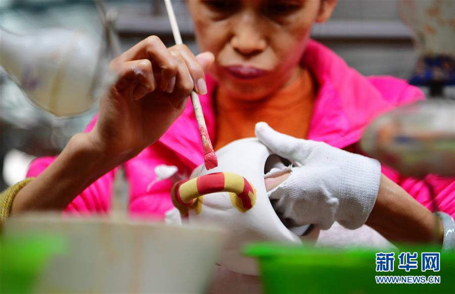 10月23日,德化順美陶瓷有限公司工人在生產(chǎn)線上給陶壺上色。 新華社記者魏培全攝