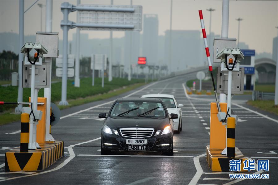 10月24日,首輛私家車行駛在澳門口岸入境車道上。當(dāng)日,港珠澳大橋正式通車。 新華社記者張金加攝