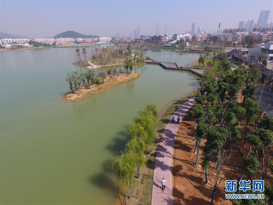 這是10月29日無人機拍攝的長沙后湖。 近日,湖南長沙后湖水環(huán)境綜合整治工程全面完工,沿湖生態(tài)環(huán)境舊貌換新顏,成為市民游客休閑散步的好去處。 新華社記者 龍弘濤 攝