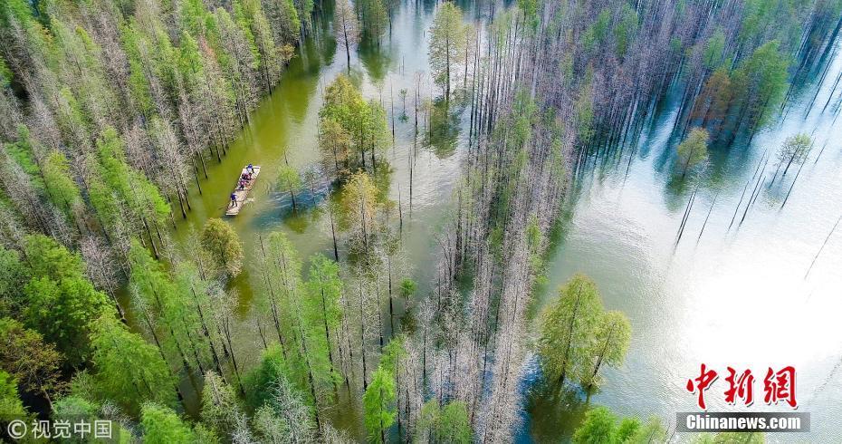 10月5日,航拍安徽宣城寧國(guó)方塘鄉(xiāng)汪村青龍湖港口灣水庫(kù),游客們泛舟湖上,穿梭于紅杉林中,享受秋日的美好時(shí)光。 圖片來(lái)源:視覺中國(guó)