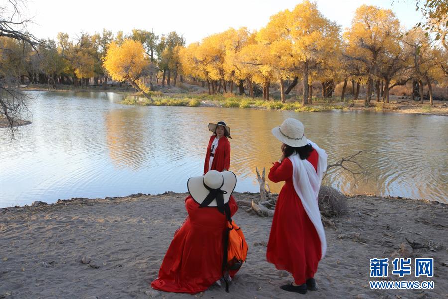 10月10日,在內(nèi)蒙古自治區(qū)額濟(jì)納旗,游客在胡楊林前留影。 金秋時(shí)節(jié),內(nèi)蒙古自治區(qū)額濟(jì)納旗胡楊林如同披上金裝,成為大漠中的一抹亮色,吸引眾多中外游客前來(lái)觀賞游玩。 新華社記者安希雅攝