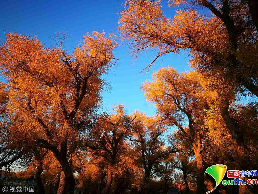 中國(guó)青年網(wǎng)北京10月9日電 2018年10月7日至8日,內(nèi)蒙古自治區(qū)阿拉善盟額濟(jì)納旗,地處巴丹吉林沙漠。額濟(jì)納河兩岸壯觀的胡楊林堪稱大漠的一顆綠色明珠,每年深秋時(shí)節(jié)的第一場(chǎng)秋霜過后,大片的胡楊樹葉由綠變黃,一眼望去,陽(yáng)光下金色的樹葉襯著湛藍(lán)的天空于風(fēng)中婆娑起舞,鮮明的影調(diào),亮麗的色彩,令人流連忘返。