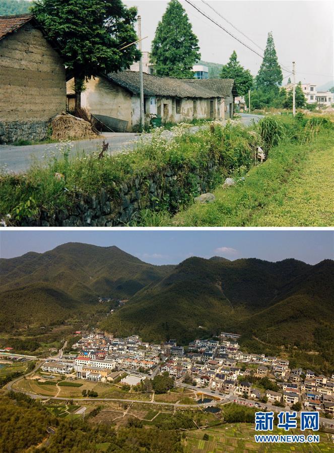 拼版照片:上圖為浙江省湖州市安吉縣天荒坪鎮(zhèn)余村村1988年時(shí)的資料照片;下圖為2018年3月23日無人機(jī)拍攝的浙江省安吉縣天荒坪鎮(zhèn)余村村(新華社記者黃宗治攝)。新華社記者 黃宗治 攝