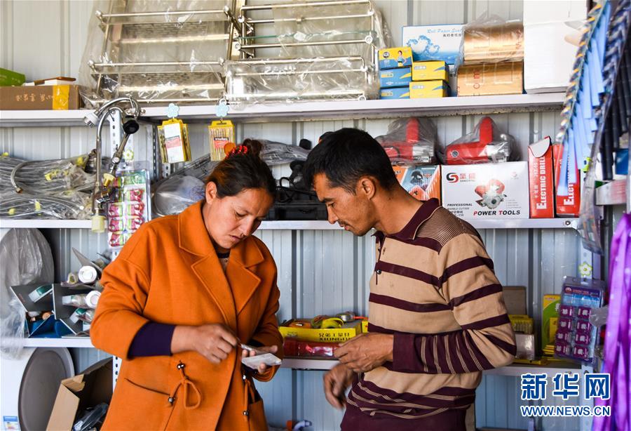 在位于澤普縣桐安鄉(xiāng)的建材鋪里,熱娜古麗·喀爾曼(左)跟前來購(gòu)買建材的顧客交談(10月28日攝)。 新華社記者 關(guān)俏俏 攝