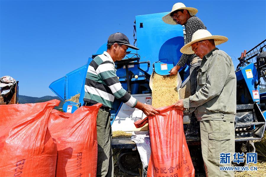 10月31日,武夷山市興田鎮(zhèn)南岸村農(nóng)民在裝運(yùn)稻谷。 新華社記者 張國(guó)俊 攝