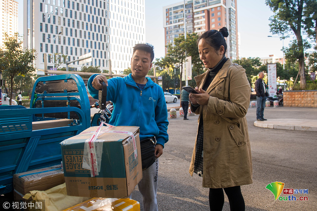 2018年10月16日,云南省昆明市,攝影師實拍90后快遞員熊忠桃的一天工作。作為一名快遞員,他25歲就買了房,9月份收入3萬多。圖片作者:銳圖