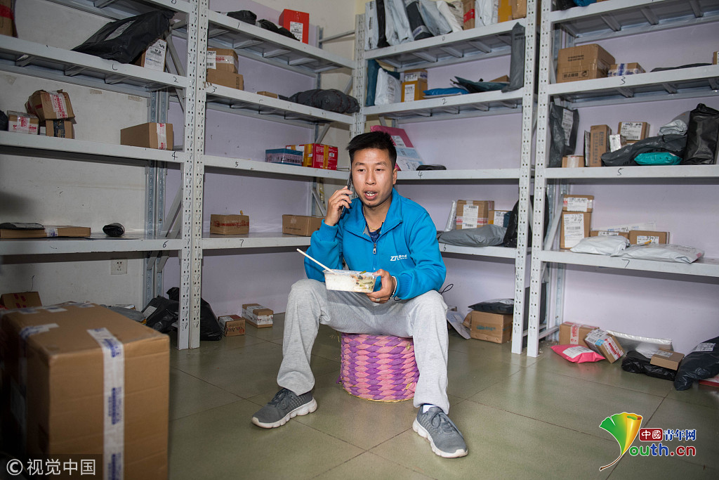 云南省昆明市,攝影師實拍90后快遞員熊忠桃的一天工作。作為一名快遞員,他25歲就買了房。圖片作者:銳圖
