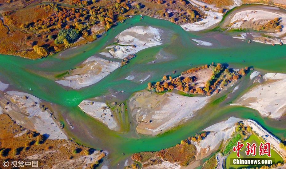 10月5日,新疆巴音郭楞,流過新疆和靜縣巴潤哈爾莫敦鎮(zhèn)的開都河秋景(無人機(jī)拍攝)。 圖片來源:視覺中國