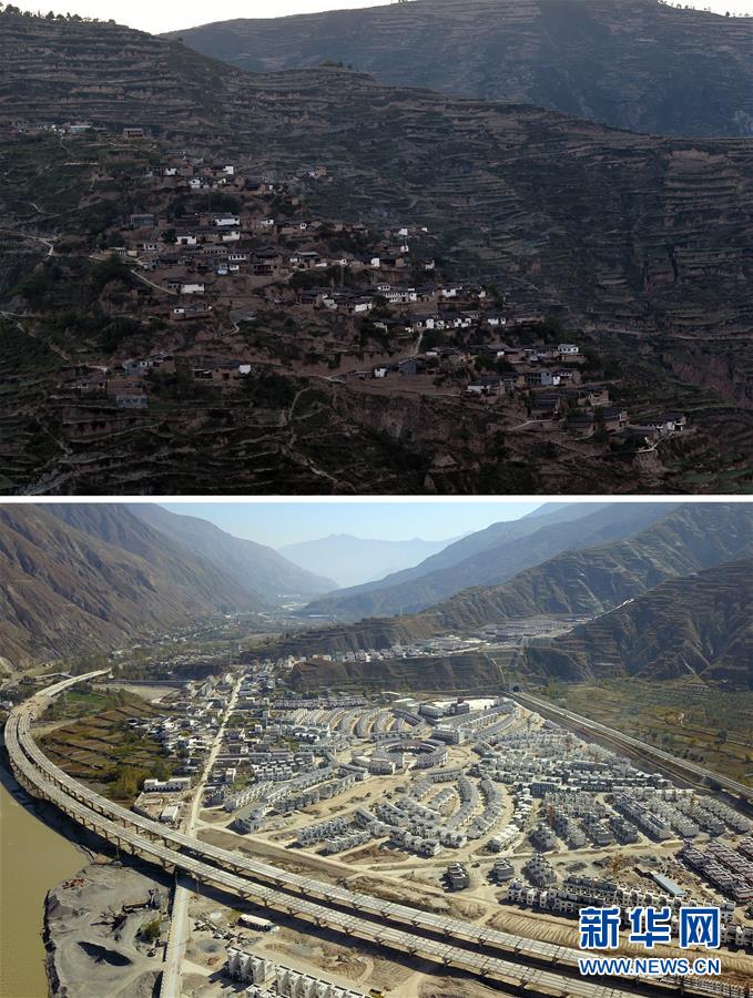 這是一張拼版照片。上圖為隴南市武都區(qū)坪埡藏族鄉(xiāng)腰道村全景(2016年9月1日攝);下圖為隴南市武都區(qū)的“新坪埡”全景(10月31日無人機拍攝)。歷經3年多的建設,在甘肅省隴南市武都區(qū)白龍江畔,一個嶄新的“新坪埡”即將建成,預計今年年底實現(xiàn)全面建成搬遷。 坪埡藏族鄉(xiāng)是甘肅省隴南市25個特困片區(qū)鄉(xiāng)鎮(zhèn)之一,2015年,當?shù)卣龀銎簣翰刈遴l(xiāng)易地扶貧搬遷重大決策,對深山上的8個村1236戶5731人實施易地扶貧搬遷,總投資4.69億元,是甘肅省“十三五”時期易地扶貧搬遷工程重點建設項目。 全面建成搬遷后,當?shù)卣畬Π徇w安置區(qū)與周邊景區(qū)進行整體規(guī)劃,打造民族風情和鄉(xiāng)村生態(tài)旅游村;同時加大群眾專業(yè)技能培訓,并引進企業(yè)實現(xiàn)群眾本地就業(yè),幫助搬遷群眾增收致富。新華社記者 范培珅攝