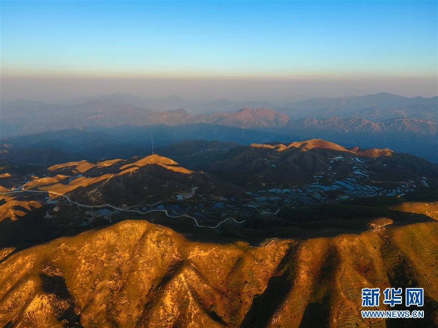 夕陽下的摩天嶺草場(chǎng)(11月2日無人機(jī)拍攝)。金秋時(shí)節(jié),廣西融水苗族自治縣桿洞鄉(xiāng)堯告村的摩天嶺草場(chǎng)天高云淡,景色迷人。新華社記者周華攝